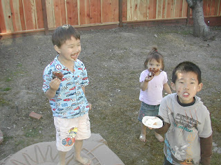 Our friends Chun Fen and Jin Yan with their son, Jimmy. Their other son, Wei, is taking the picture. This was our hysterical attempt at a nice family photo. Notice how miserable the birthday boy is here. All the kids are looking anywhere but at the camera.